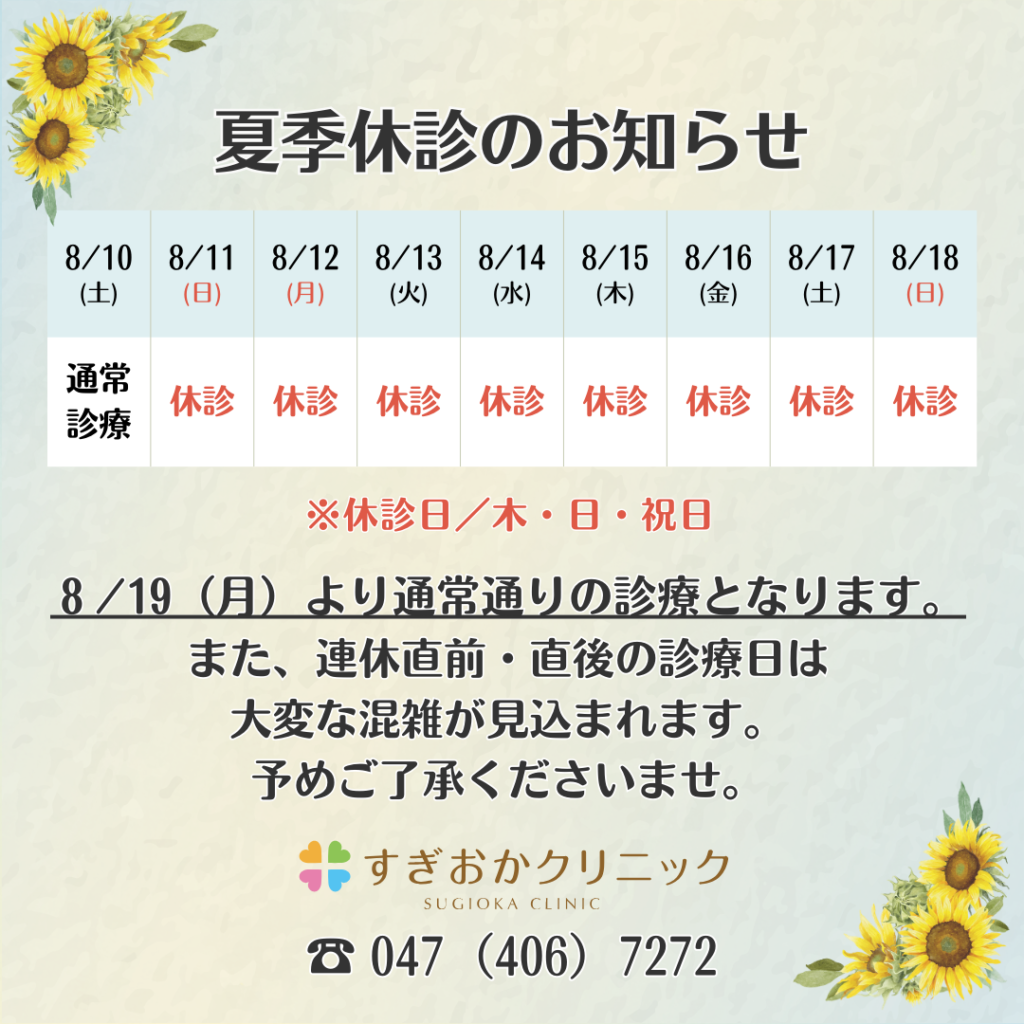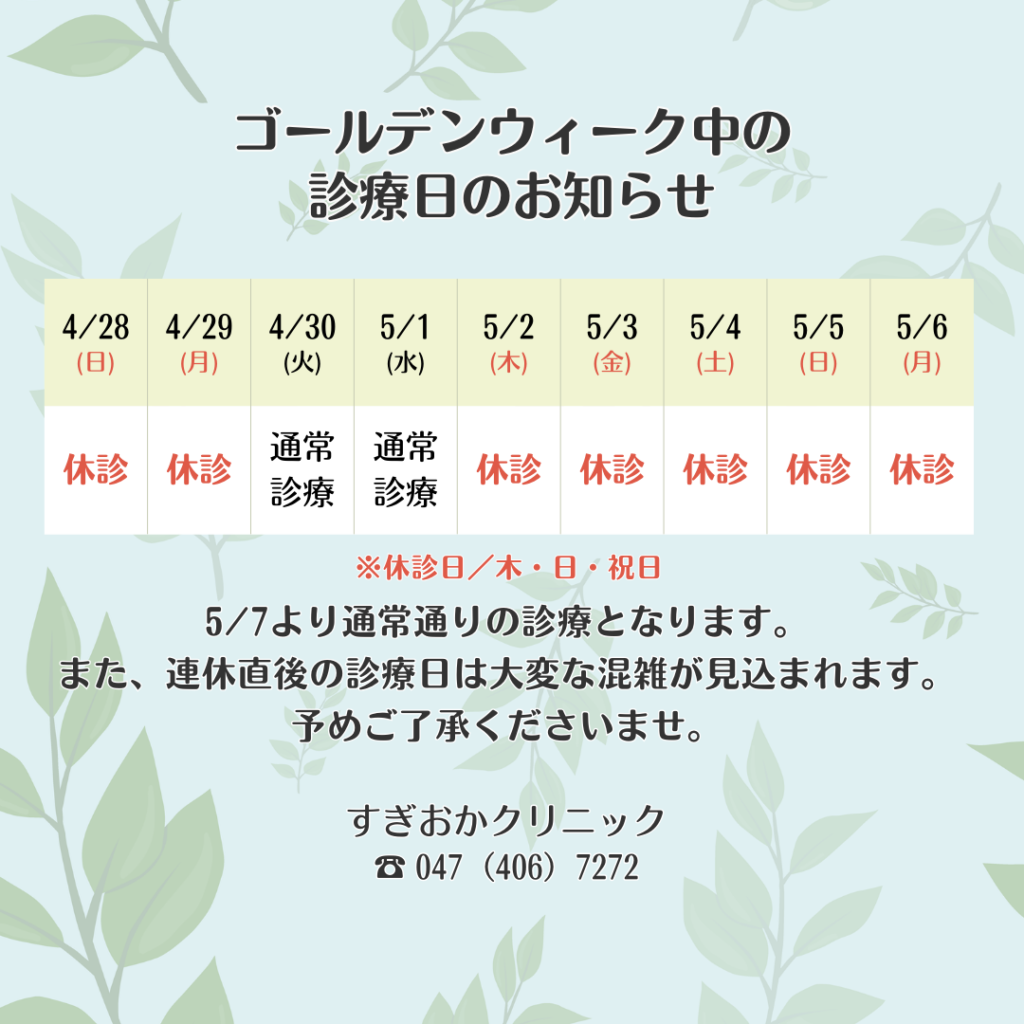 いつもすぎおかクリニックをご利用いただき、ありがとうございます。