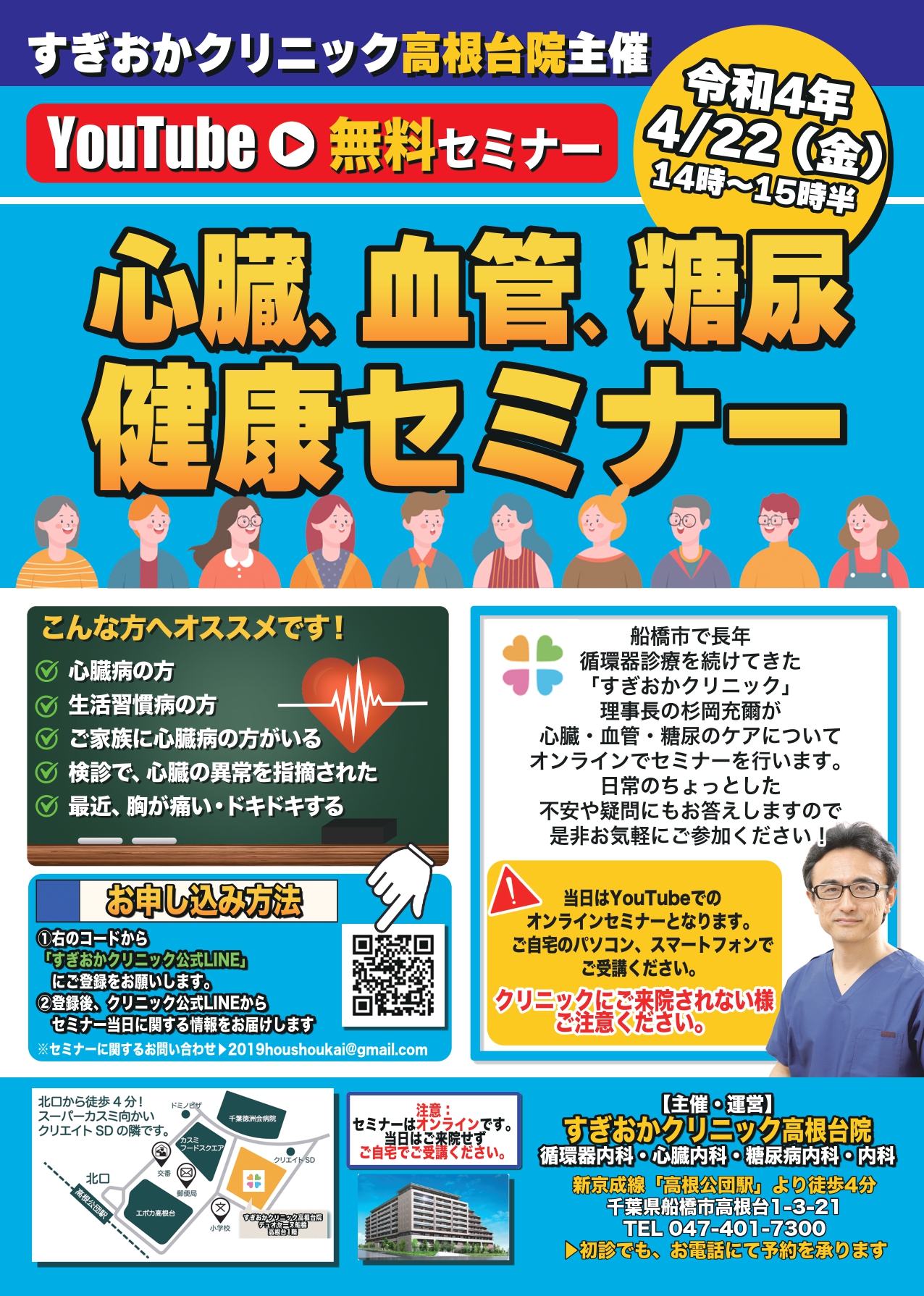 杉岡理事長がYoutubeにおいて、心臓・血管・糖尿に関する「健康セミナー」をオンラインセミナーで開催することになりました。